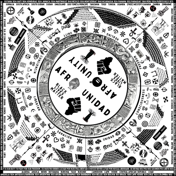 This divine cloth includes 50+ distinct Afro symbols from all over the Mother Land and diaspora. Some go back thousands of years like the Ankh, Eye of Horus, and Adinkra. The two circles come from an Ifa divination tray and a Maasai necklace. The border includes a sacred chant in four languages and a list of 100+ countries; every nation in Africa and across the diaspora. The years of emancipation are listed for the 50+ countries across the diaspora.