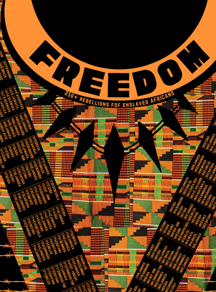 This shirt features 250 rebellions of enslave African people across the diaspora starting in 1503. It lists the year and country. Kente pattern design on a polyester/silky shirt. Hand wash or machine wash.