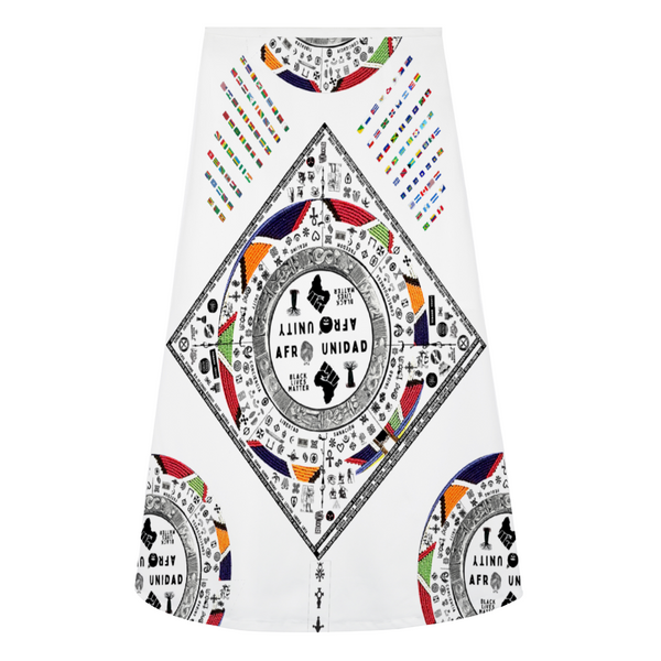 Afro Unidad design on front and back. 95% Polyester + 5% spandex. Midi skirt falls below the knee, high-waisted, zipper closure.